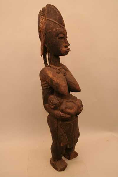 1117/4236.Maternité Bambara,ancienne statue guandoudou représentant une femme importante,portant un enfant dans les bras.La femme porte un collier de guerrier autour du cou,des bracelets autour des bras,et une coiffe royale.:bois brun foncé,érodé à certains endroits H.90cm.début du 20eme sc.(la mèche de cheveux à sa gauche a disparu.)(Nafaya)