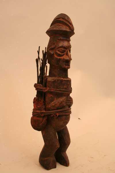 Ritueel Yaka beeld (Biteki)28cm.hoog.Een rechtstaande voorouder met de handen op zijn buik.Langs beide kanten een zakje magische produkten waaruit stokjes kwamen om de geesten te ontvangen en te versterken.