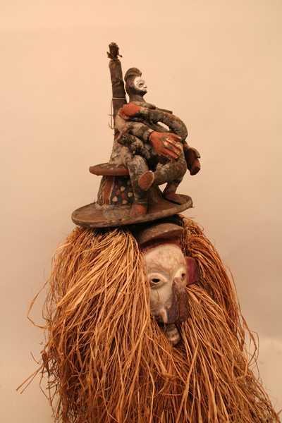 1222/4507.Masque Mbaala.Dans la société d'initiation et de circoncision des jeunes, il se donne comme chef des masques de danses.Il porte souvent une figurine dont le corps est en vannerie et parfois les extrémités en bois( mains, jambes ou la tête.)et qui d'habitude est assise sur le masque et appuyée contre la haute coiffe. Remarque la puissance accordée aux visages en polychrome.Içi sur le masque est réprésenté une femme tenant son enfant.début du 20eme sc.bois,raphia, tissus,fibres,polychrome. H.73cm (coll..Maud à Paris 1978)
