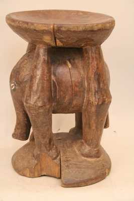 1342/5305.Ancien tabouret Suku H.40cm. représentant un éléphant debout sur un socle rond et portant un plateau.Les yeux sont fait de cauries.Bois naturel avec vieille patine.1ère moitié du 20eme sc.(Minga)
