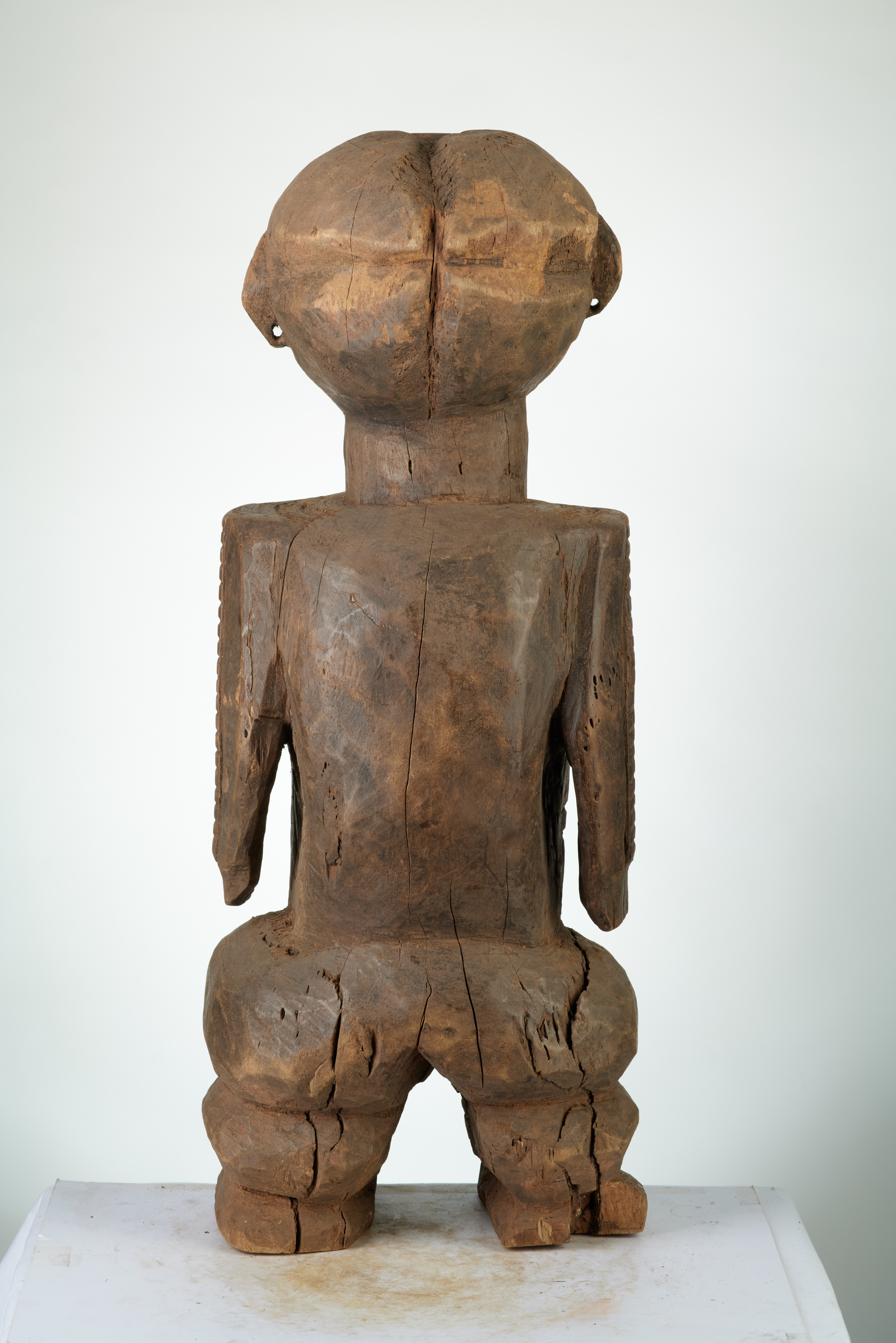 Ngbaka beeld (Ubangi streek).Het stelt een mannelijke voorouder voor,rechtstaand,de armen gestrekt langs het lichaam.bruine patina,scarificaties in het aangezicht h.72cm. (19de eeuw-begin 20ste eeuw.)Kol.Minga Zaire 1970