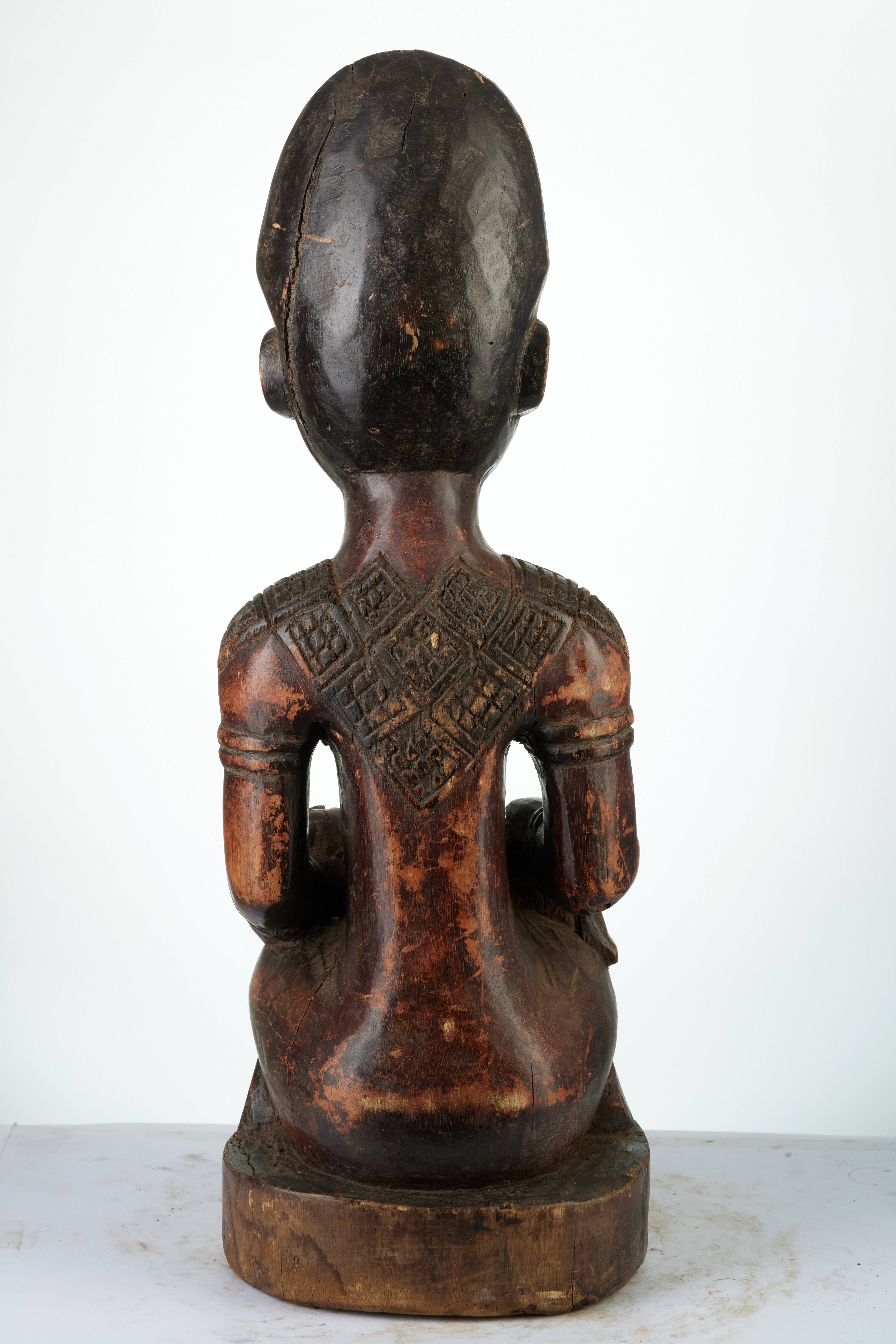 1819; Maternité assise pfemba, De la patinne rouge rouge, région côtière de Ngoyo ,coiffure en forme de mitre noir ,des scarifications en losanges typique du Mayombe.Elle porte des bracelets autour des bras et des poignets.Les yeux en verres et pupille noir.Le cou ,les lèvres et les sourcils bien travaillés.L'enfant ne présente aucun signe de vitalité H.58cm.begin 20ste eeuw.(col;Minga Zaire 1963)