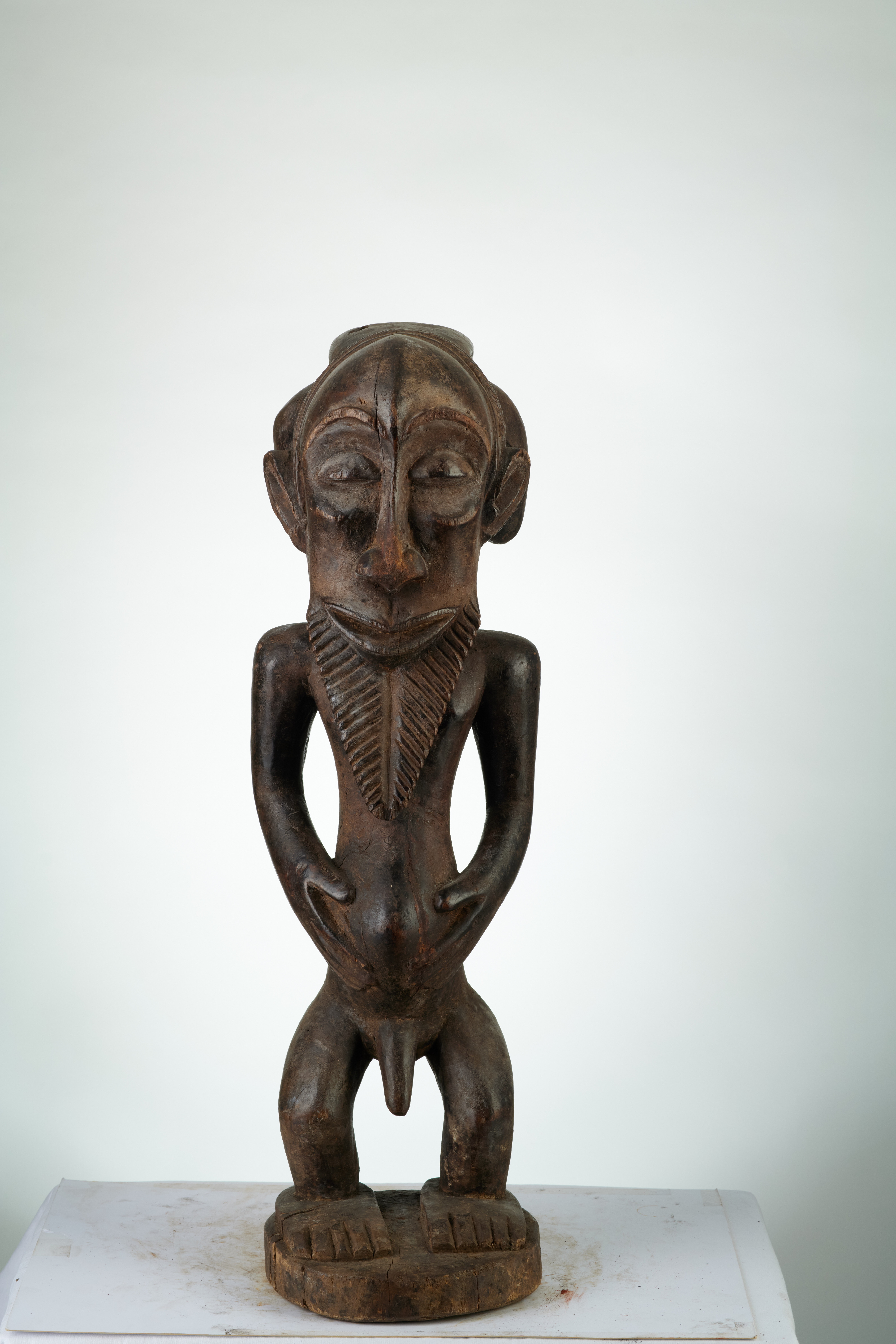 Hemba voorouder beeld met baard, de handen op zijn buik geplaatst,de benen lichtjes geplooid( Bulli stijl) H.60cm. Hemba haartooi. (col .Verwilghen Leon)