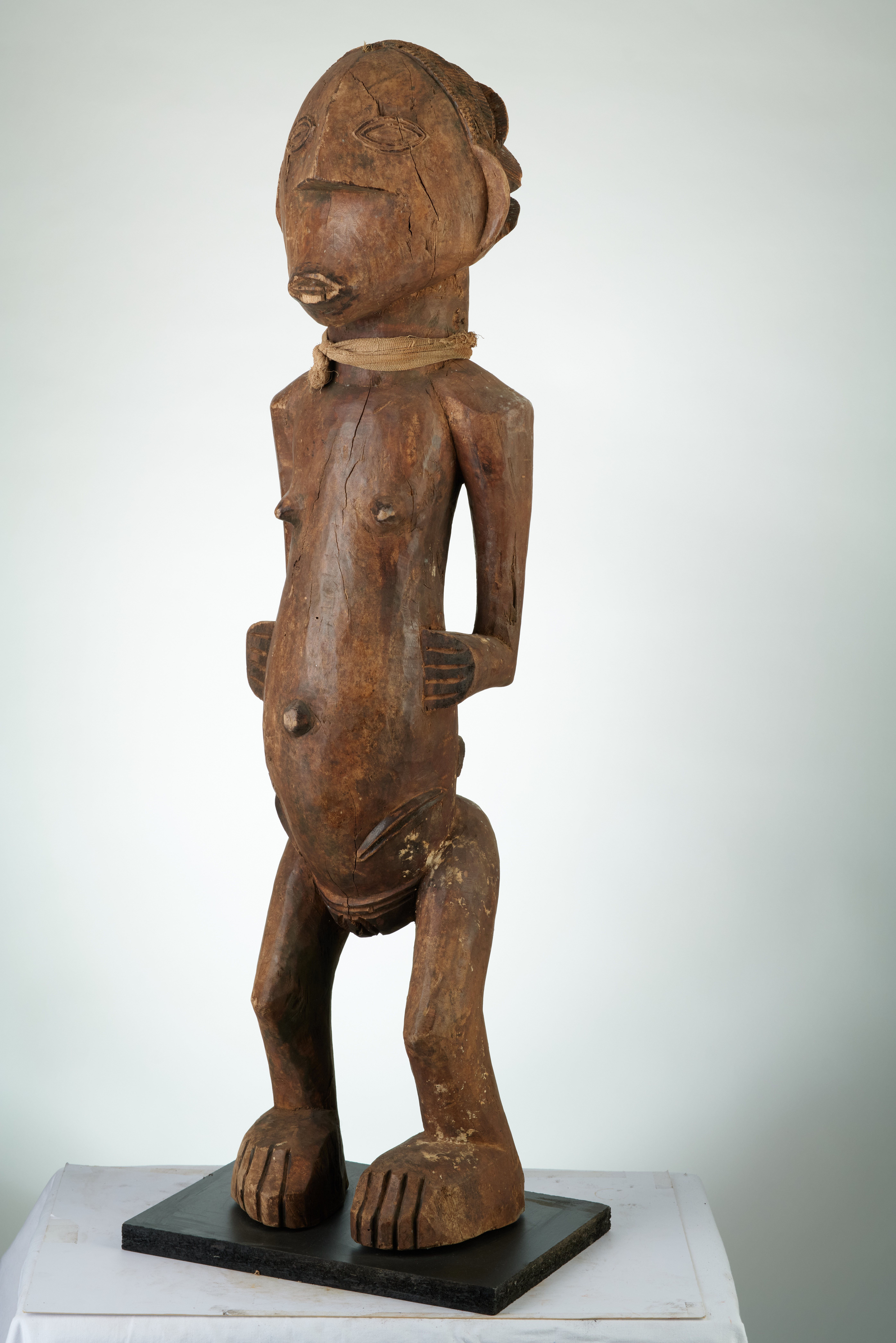 Oud Luba beeld dat een vrouwelijke voorouder voorstelt,rechtstaand,de twee handen op de heupen,een gele vod rond haar hals,de benen lichtjes geplooid,de haartooi in lichte cascaden..(Col Minga  Zaire 1963.)                        . art,culture,masque,statue,statuette,pot,ivoire,exposition,expo,masque original,masques,statues,statuettes,pots,expositions,expo,masques originaux,collectionneur d`art,art africain,culture africaine,masque africain,statue africaine,statuette africaine,pot africain,ivoire africain,exposition africain,expo africain,masque origina africainl,masques africains,statues africaines,statuettes africaines,pots africains,expositions africaines,expo africaines,masques originaux  africains,collectionneur d`art africain LUBA(statue), d`afrique : rep.dem.Congo, statuette LUBA(statue), masque ancien africain LUBA(statue), art du rep.dem.Congo - Art Africain, collection privées Belgique. Statue africaine de la tribu des LUBA(statue), provenant du rep.dem.Congo, 1835: Ancienne statue Luba H.87cm.Une ancêtre debout les mains posés sur les hanches,un chiffon autour du cou,les jambes légèrement plées.Coiffure en légères cascades.(col Minga  Zaire 1963.