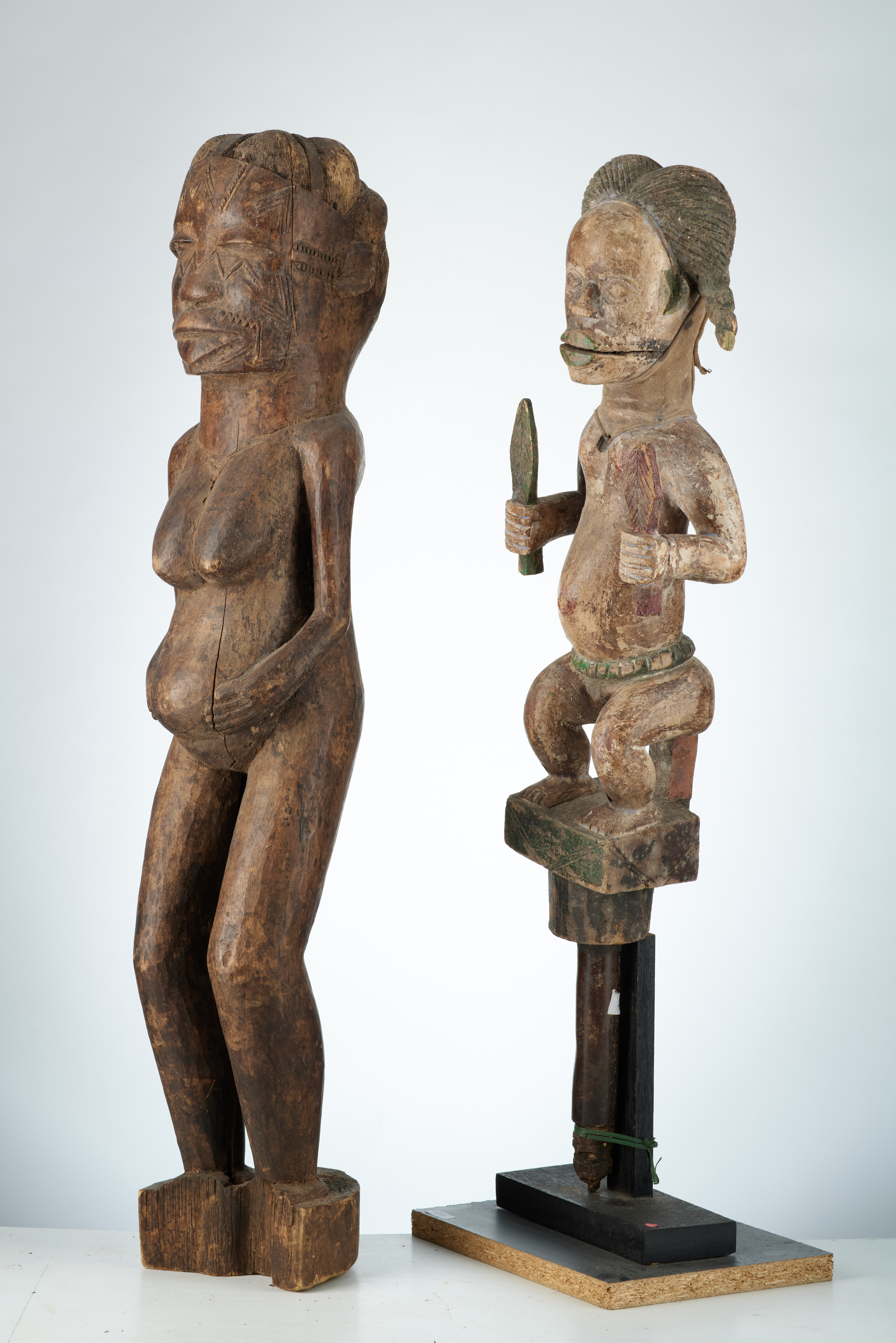 213/458.Belle statue d'ancêtre Makondé.Elle représente une femme enceinte,debout,tenant ses deux mains sur son ventre.Le visage est assez large,plein de scarifications.Dans la coiffure divisée en plusieurs lobes(10) étaient planté des vrai cheveux qui ont disparus en grande partie.(bois léger)(Nafaya)