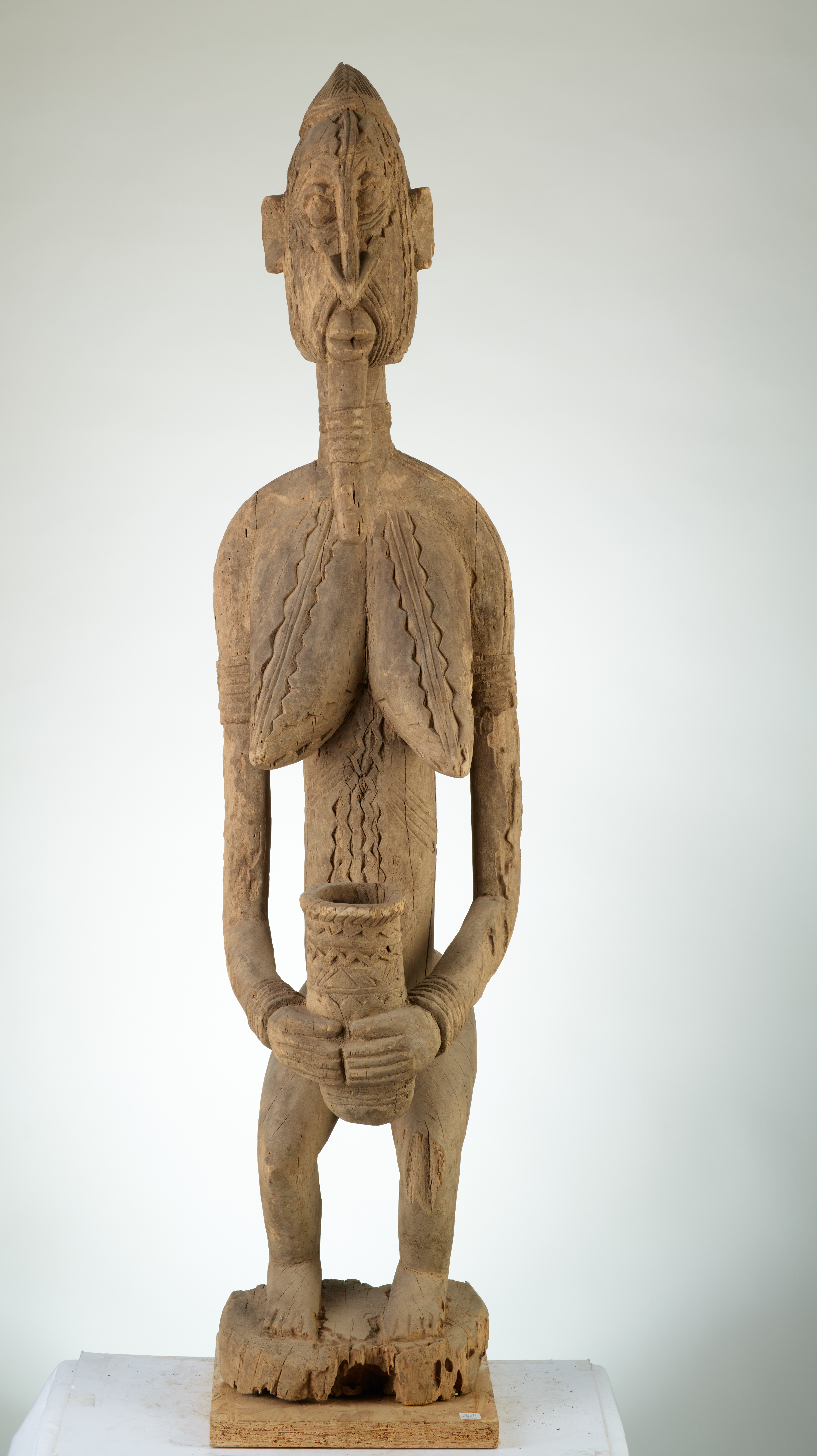 244/750.Maternité Dogon représentant une ancêtre portant un labret au menton,debout les jambes pliées,ayant un enfant sur son dos et portant une coupe dans les mains. La statue a une h.t.119cm.;une grande tête de h.26cm.; le corps a 60cm.La statue a une bosse.bois érodé,début du 20eme sc.